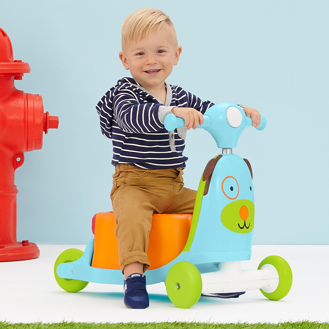 Projetado para crescer com seu filho em três estágios de diversão, o brinquedo bonito e colorido de Skip Hop oferece uma maneira divertida de incentivar o desenvolvimento de habilidades motoras, equilíbrio e coordenação na hora de brincar. O primeiro estágio, projetado para os primeiros caminhantes, motiva os mais pequenos a empurrar e puxar no modo de carroça - um ótimo local para os brinquedos favoritos também. No estágio dois, a cuba de armazenamento do vagão se converte em um assento para o modo de transporte. Pronto para o estágio três? Basta remover o assento, puxar para cima a alça ajustável para seu filho pequeno, subir na scooter e dar uma volta! Eles vão adorar pressionar o botão na frente para um farol, melodias, um som de bipe e mais efeitos sonoros divertidos enquanto eles avançam.